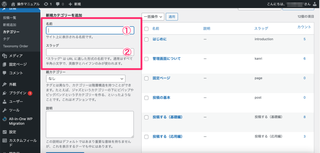 ②「カテゴリー名」と「スラッグ」を入力して、「新規カテゴリーを追加」を押します。