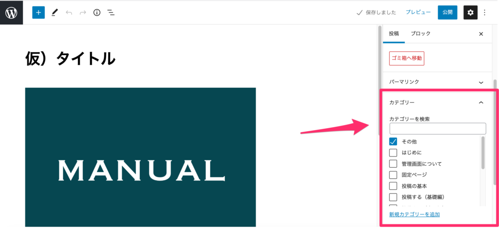 編集画面の右側パネルに「カテゴリー」項目があります。予め追加したカテゴリーにチェックを入れれば設定できます。 ※「新規カテゴリーを追加」からでもカテゴリーを追加することが可能ですので、必要に応じてご利用ください。