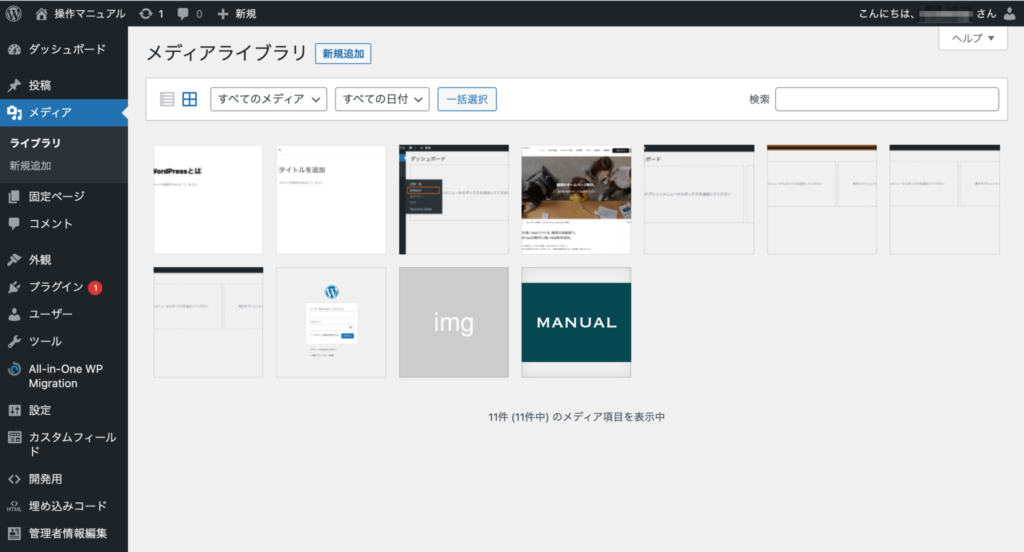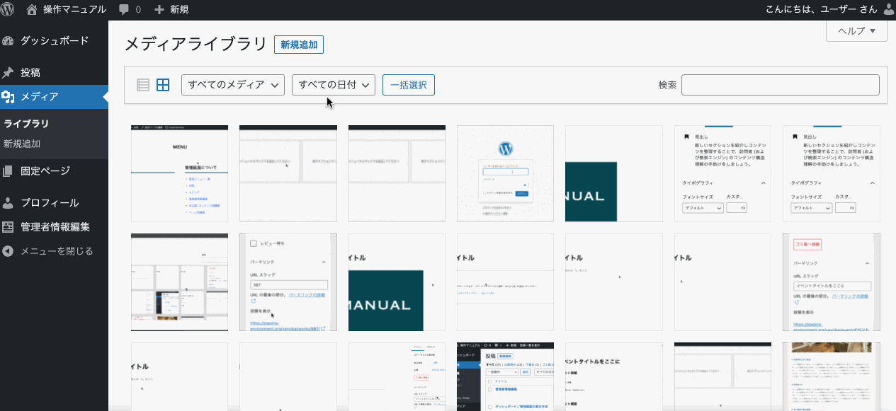 サイト内で使用されている画像等は全てこちらに保管されていて、WordPressに保存されている画像や動画を確認することができます。またメディアライブラリから新たな画像や動画を追加登録することができます。 ブログ記事やサイト内で画像を使用する場合は、メディアライブラリに追加してください。 ライブラリーを選択すると、メディアライブラリが開き登録されている画像、動画を一覧で確認できます。 メディアライブラリに画像を追加する 新規追加を押して、ファイルドロップかファイルを選択します。