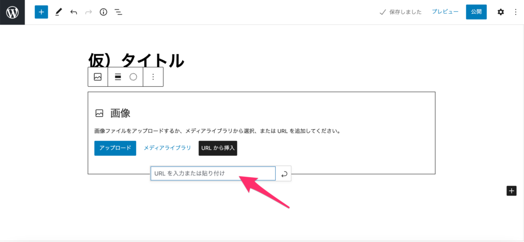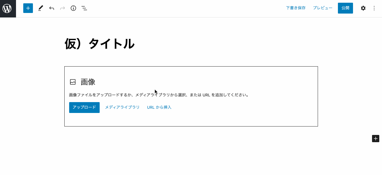 ①ブロックのアイコンを開いて、画像アイコンを選択すると「アップロード」「メディアライブラリ」「URLから挿入」の3つが表示されます。