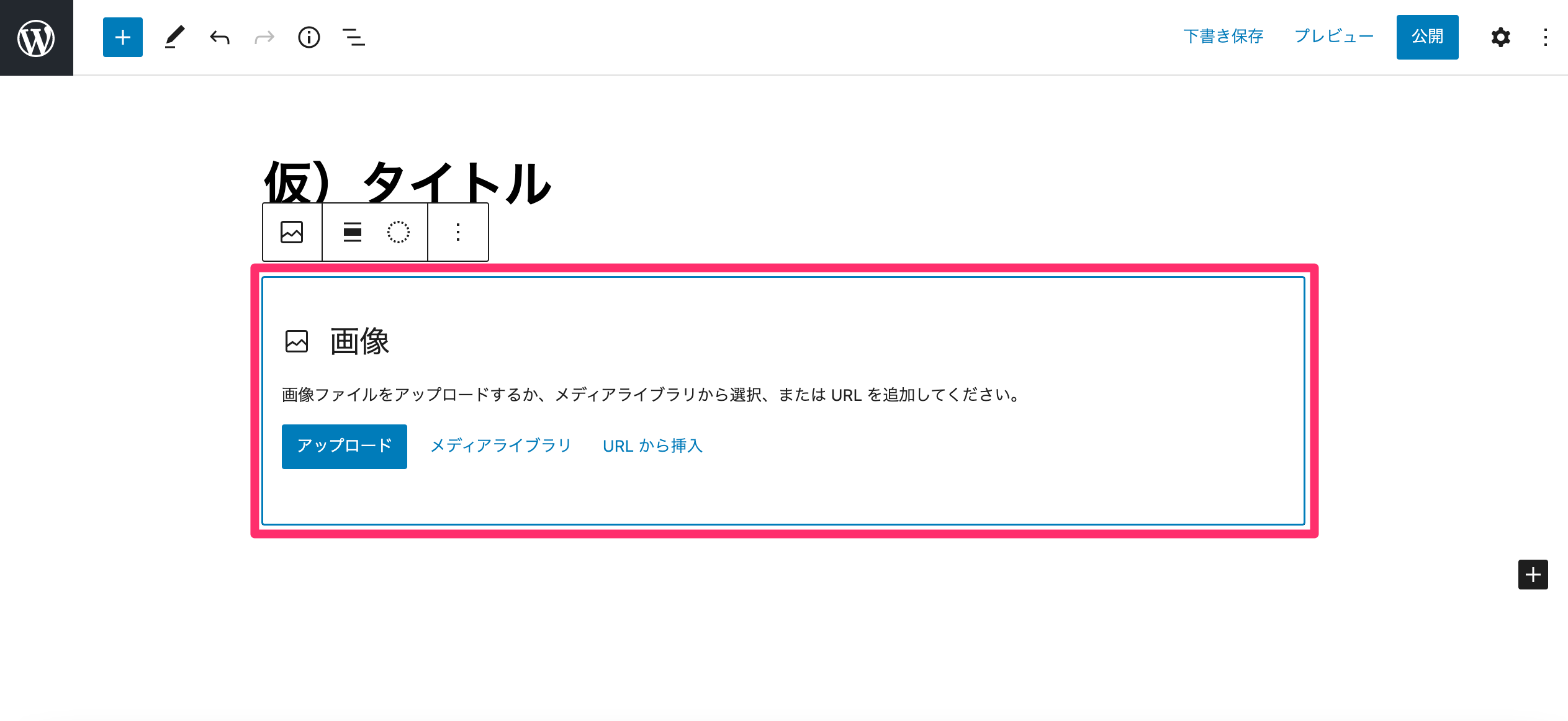 ①ブロックのアイコンを開いて、画像アイコンを選択すると「アップロード」「メディアライブラリ」「URLから挿入」の3つが表示されます。